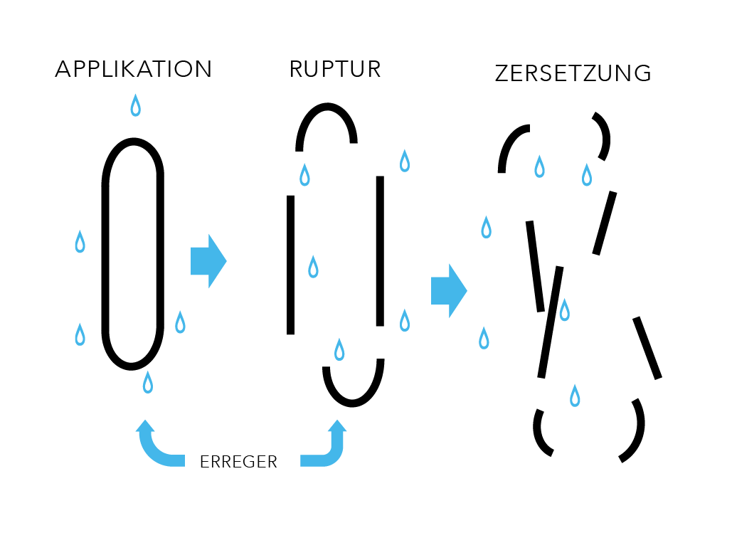 Veriforte® umspült einzellige Mikroorganismen. Die hypochlorige Säure greift die Zellwand der Mikroorganismen an und erhöht deren Permeabilität. Es kommt zur Osmolyse: Durch den zunehmenden Innendruck platzen die Zellen und werden inaktiviert.